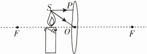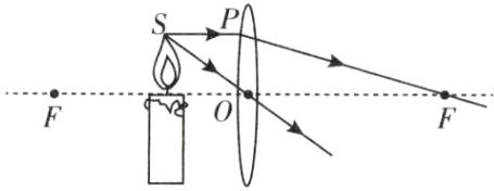 4. 如图所示,请画出由烛焰上 $S$ 点发出的两束光经过凸透镜后的折射光线。(光线 $SP$ 平行于主光轴)