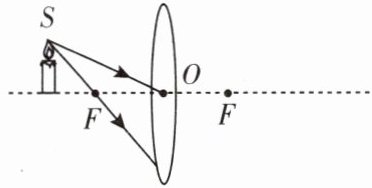3. 如图所示,蜡烛放在如图所示位置,$S$ 为烛焰上的一点,请作出 $S$ 发出的两束光经凸透镜后的折射光线。