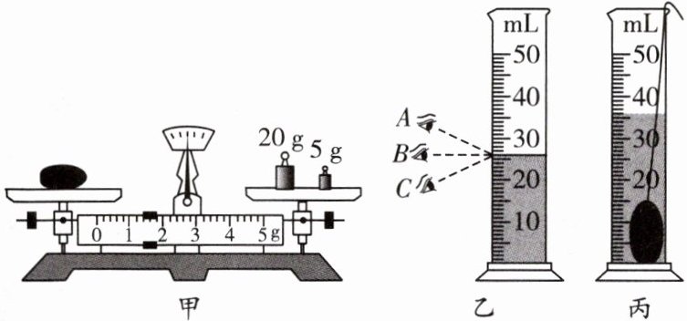 (选填“$ A $”“$ B $”或“$ C $”)角度读数。(4) 如图丙所示,用细绳系住石块,缓慢地放入水中,测出石块的体积为