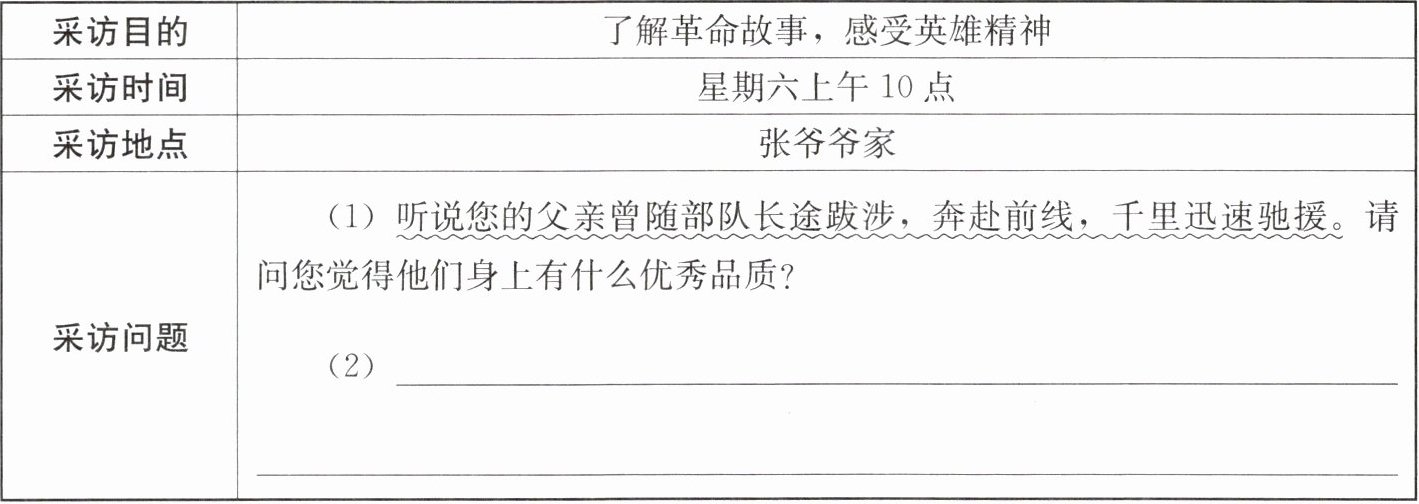 2. 【采访·聆听英雄故事】军军想采访邻居张爷爷,因为张爷爷已逝的父亲是抗战老兵。下表是军军准备的采访提纲。