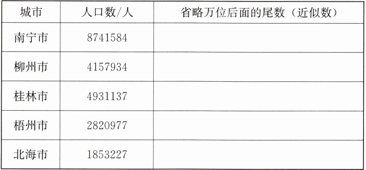4 下面是我国第七次人口普查广西部分城市的常住人口数据,先求出各数的近似数,再把所得的近似数按从小到大的顺序排一排。
