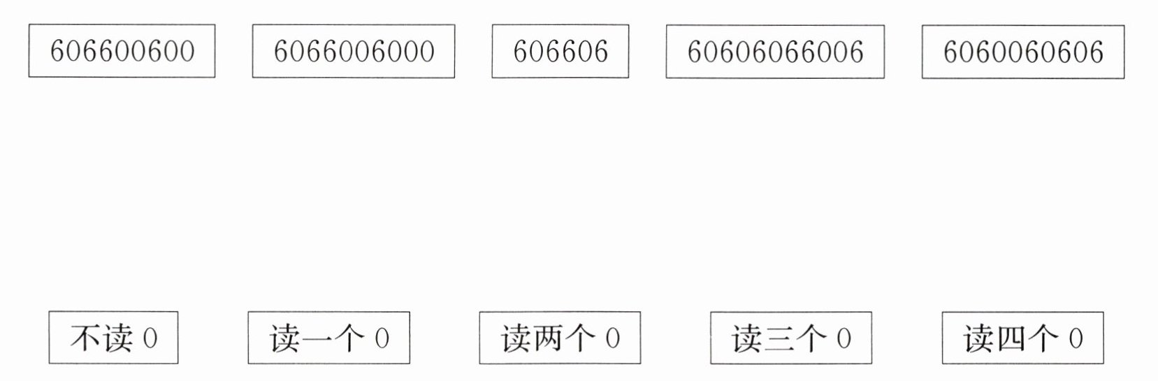 606600600-读两个0;6066006000-不读0;606606-读一个0;60606066006-读四个0;6060060606-读三个0