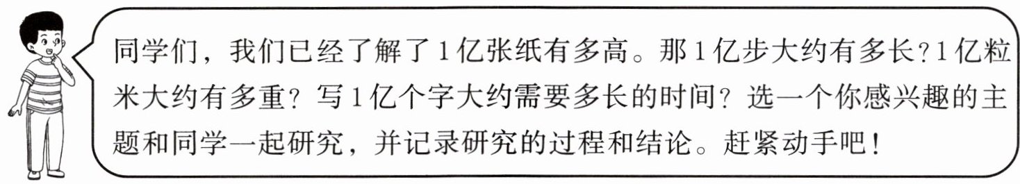 1亿步的长度约等于绕地球赤道一圈(约40076千米),体会到1亿是非常大的数,生活中要合理规划步数,感受大数在实际中的意义。