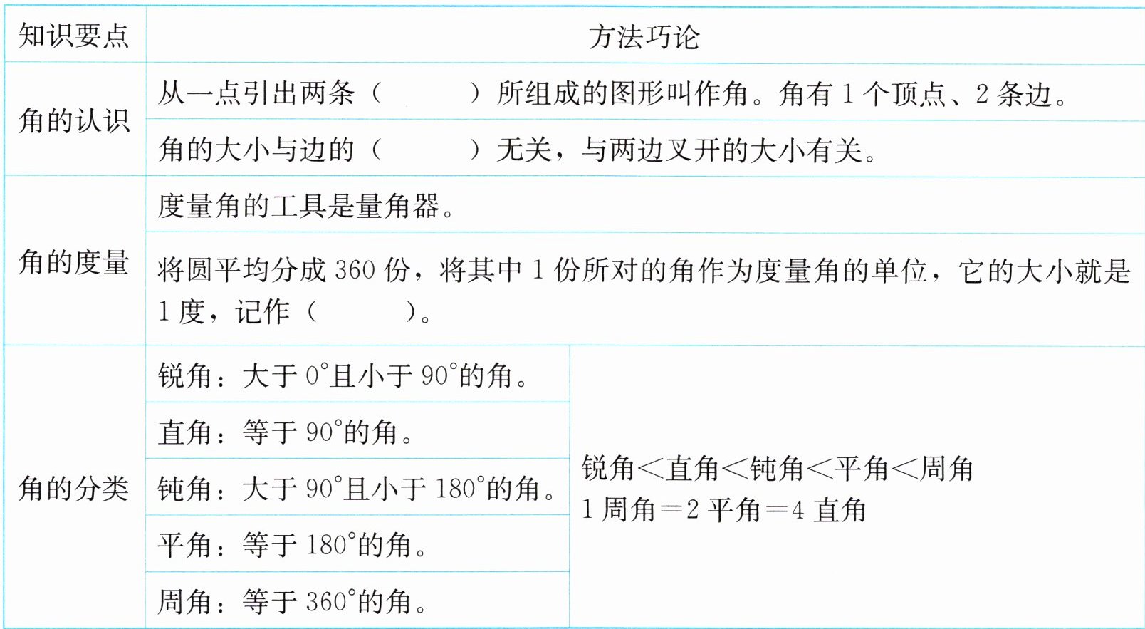 锐角<直角<钝角<平角<周角