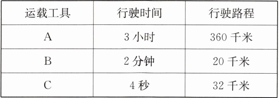 5 下面是三种运载工具的行驶情况,比较一下,哪种运载工具行驶的速度最快?说明理由。