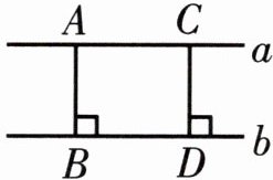 2 如图中, $ a // b $,线段 $ AB $ 和 $ CD $ 的长度( ),线段 $ AB $ 与 $ CD $ 的位置关系是( )。