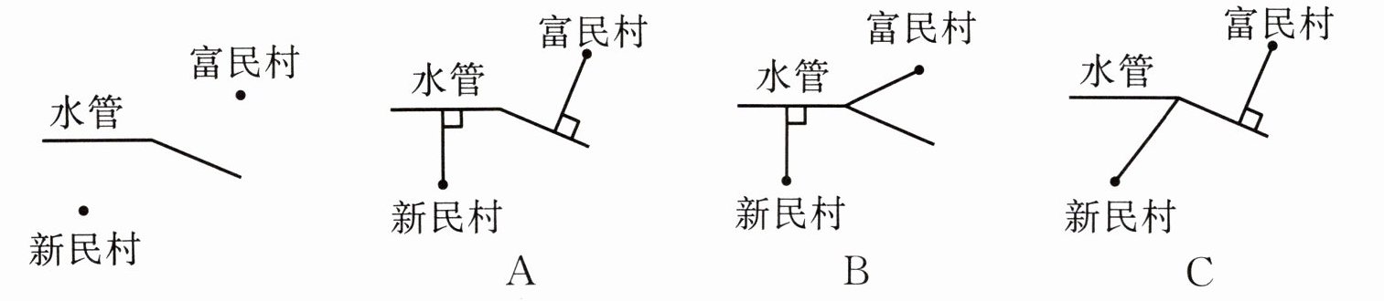 3. 新民村和富民村要接通水管,下列选项中最省材料的修建方式是(