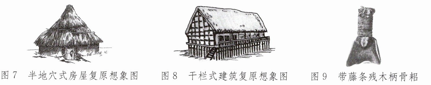 (1)材料一中,图7和图8分别是我国古代哪一类远古先民居住的房屋式样?根据图9,说出六七千年前的生产工具的制作方式。
