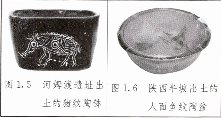 图1.5 河姆渡遗址出土的猪纹陶钵图1.6 陕西半坡出土的人面鱼纹陶盆
