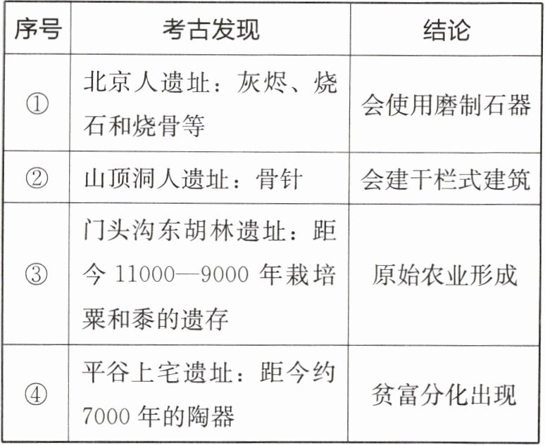 序号考古发现结论①北京人遗址:灰烬、烧石和烧骨等会使用磨制石器②山顶洞人遗址:骨针会建干栏式建筑③门头沟东胡林遗址:距今11000—9000年栽培粟和黍的遗存原始农业形成④平谷上宅遗址:距今约7000年的陶器贫富分化出现