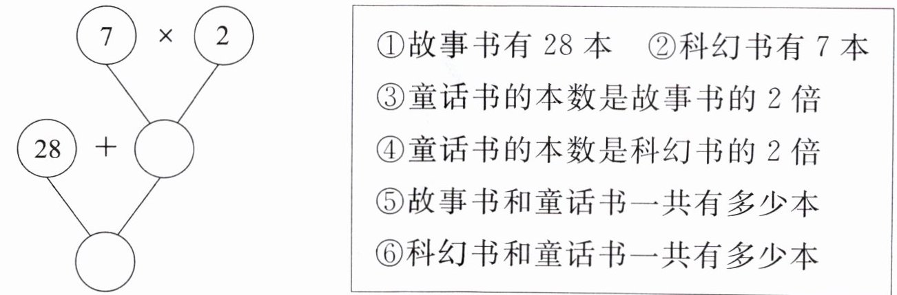 |①故事书有 28 本 ②科幻书有 7 本③童话书的本数是故事书的 2 倍④童话书的本数是科幻书的 2 倍⑤故事书和童话书一共有多少本⑥科幻书和童话书一共有多少本|