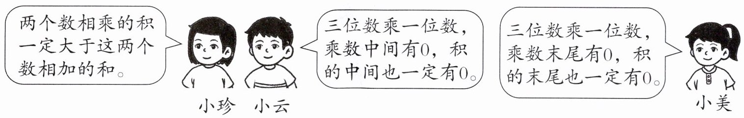 |两个数相乘的积一定大于这两个数相加的和。|三位数乘一位数,乘数中间有0,积的中间也一定有0。|三位数乘一位数,乘数末尾有0,积的末尾也一定有0。|
