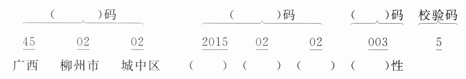 )码}$ $\overbrace{ \begin{array}{c} 5 \end{array} }^{校验码}$广西 柳州市 城中区 (