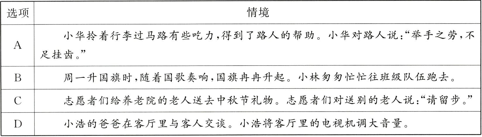 |A|小华拎着行李过马路有些吃力,得到了路人的帮助。小华对路人说:“举手之劳,不足挂齿。”|