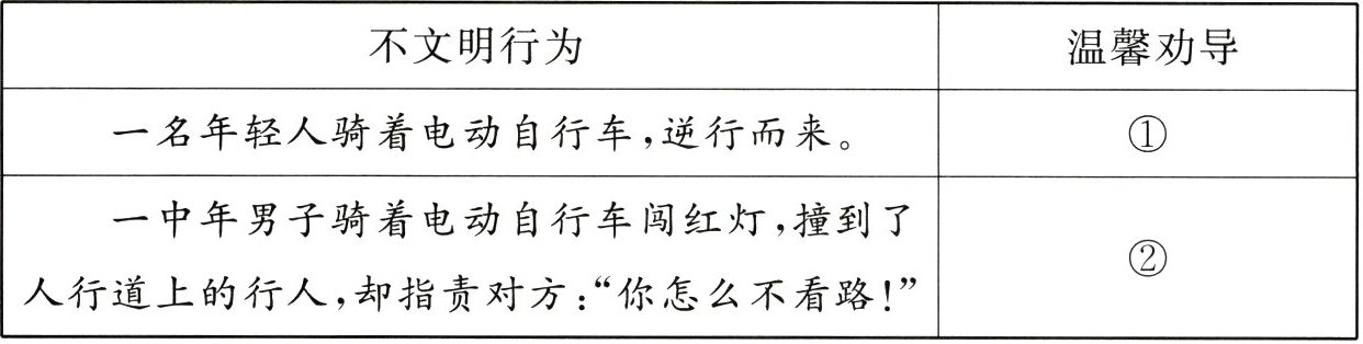 (2)①你好,骑车逆行是违反交通规则、对自己和他人生命不负责任的行为。我们要依法自律,自觉遵守交通规则,将规则内化于心、外化于行。(2 分)