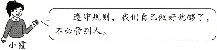 (3)小霞的观点是错误的。遵守规则,需要坚定地维护规则。一方面,要从自己做起,自觉将规则作为自己的行动准则,将规则内化于心、外化于行;另一方面,要用恰当的方法,提醒、劝导、帮助他人遵守规则,营造遵规守纪、崇德守法的良好氛围。(4 分)