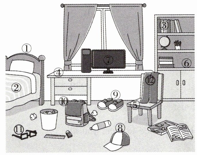 ①bed,② quilt,③ books,④ desk,⑤ chair,⑥ bookcase,⑦computer,⑧ cap,⑨ shoes,⑩ schoolbag,⑪ glasses,⑫trousers/scarf