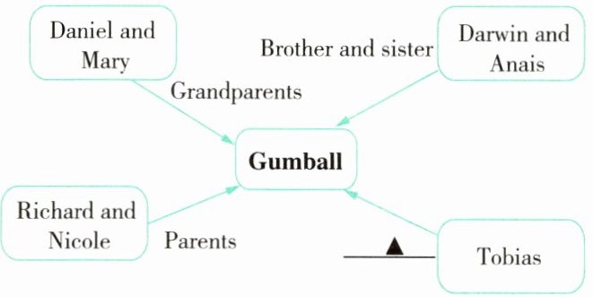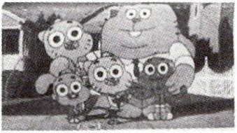 The first one is Gumball Waterson's family photo. Gumball is in the middle of the photo. Gumball's father, Richard, his mother, Nicole, and his sister, Anais, are in the photo too. Who is on the left of Gumball? He is Darwin. He is Gumball's adoptive (有收养关系的) brother. Daniel and Mary are Gumball's grandparents, but they are not in the photo.