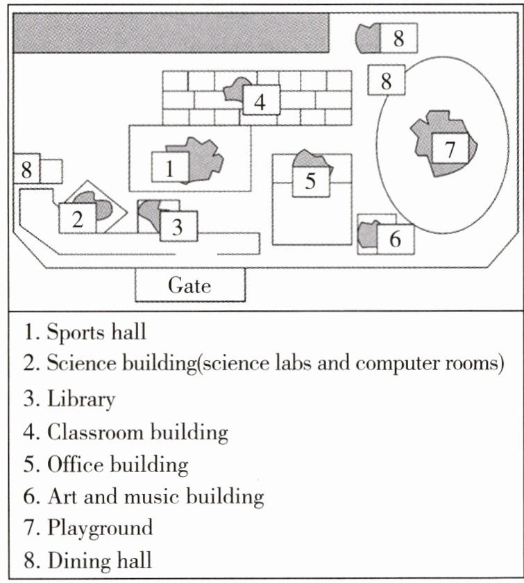 [2025汕头期末] Chen Jie is a fourteen-year-old student in Sunshine Middle School. It is a big school with many trees and flowers. There are fifty classrooms in the classroom building. And every class has 40 students. Here is a map of her school. Let's have a look at the map!