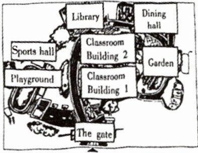 ( Here is a map of Li Hua's school. Mike wants to visit Li Hua's school. They're at the school gate. They are talking about the school. )