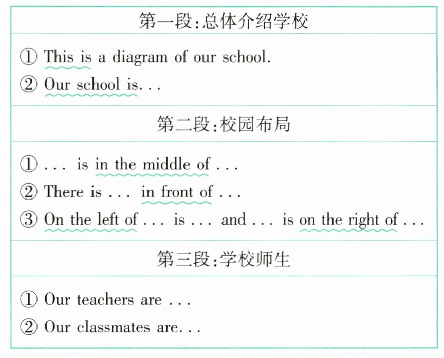 Our classroom building is in the middle of ① our school. There is a garden in front of ② the classroom building. On the left of ③ the garden is our library and our lab is on the right of ④ the garden. There is a large playground behind ⑤ the classroom building. There are many trees ⑥ in our school.