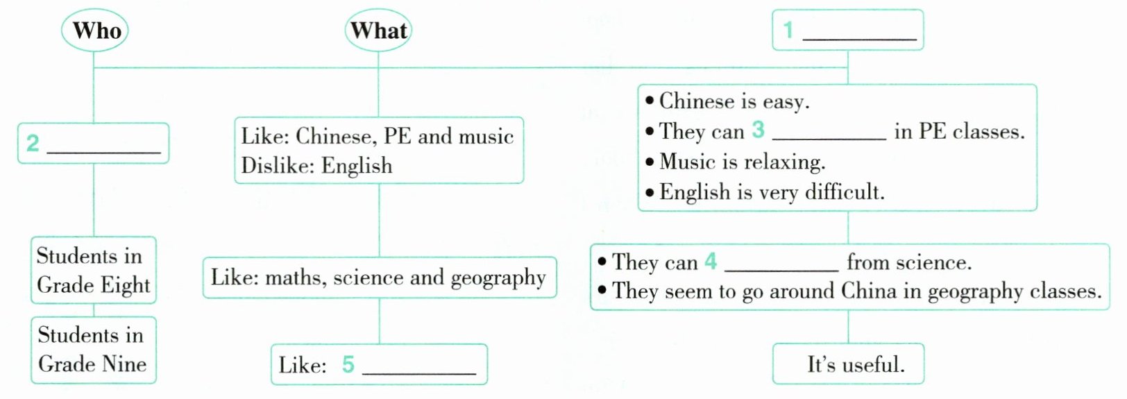 In Grade Seven, students’ favourite subject is always Chinese, because it’s their mother tongue and it’s easy for them. And most of them don’t like English. They think English is very difficult, because it’s different from Chinese. And they like PE and music too. Students at this age like playing sports. They can play soccer, basketball, etc. in PE classes. Why is music welcome? Most of them think music is relaxing.