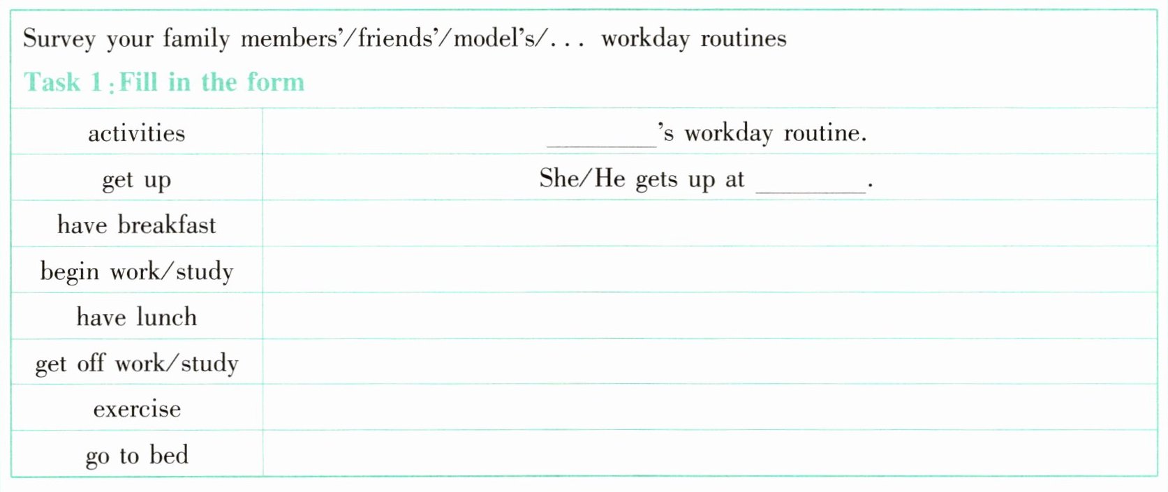 | get off work/study | He gets off work at 6:00 p.m. |