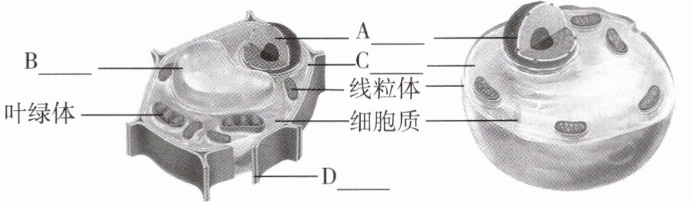 2. 细胞膜、细胞质(内含线粒体)、细胞核 3. 细胞壁、叶绿体(绿色部分)、液泡 4. 细胞