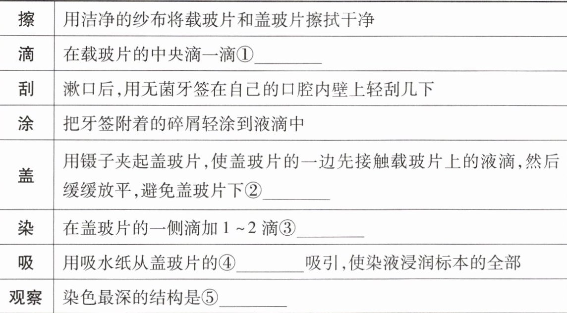 ①生理盐水 ②出现气泡 ③碘液 ④另一侧 ⑤细胞核
