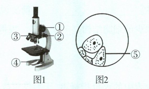 (3)图2中⑤所指的结构是细胞膜。我们在显微镜下看到的物像是上下颠倒、左右相反的物像,所以我们移动玻片标本时,标本移动的方向正好与物像移动的方向相反。图2中的物像偏左下方,向左下方移动玻片,物像会向右上方移动到视野的中央。图1中的②细准焦螺旋可以小幅度升降镜筒,可以精细调焦,使物像变得更加清晰。