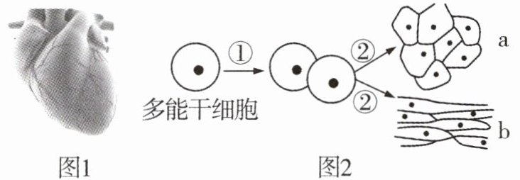 (2)3D 打印心脏的心肌细胞和上皮细胞等均来自人的多能干细胞,如图 2 所示。多能干细胞经过①