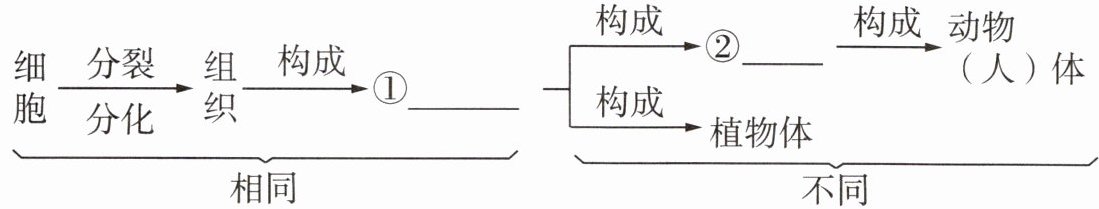 植物由细胞分裂、分化形成组织,组织构成器官(绿色开花植物有六大器官:根、茎、叶、花、果实、种子),所以①是器官。