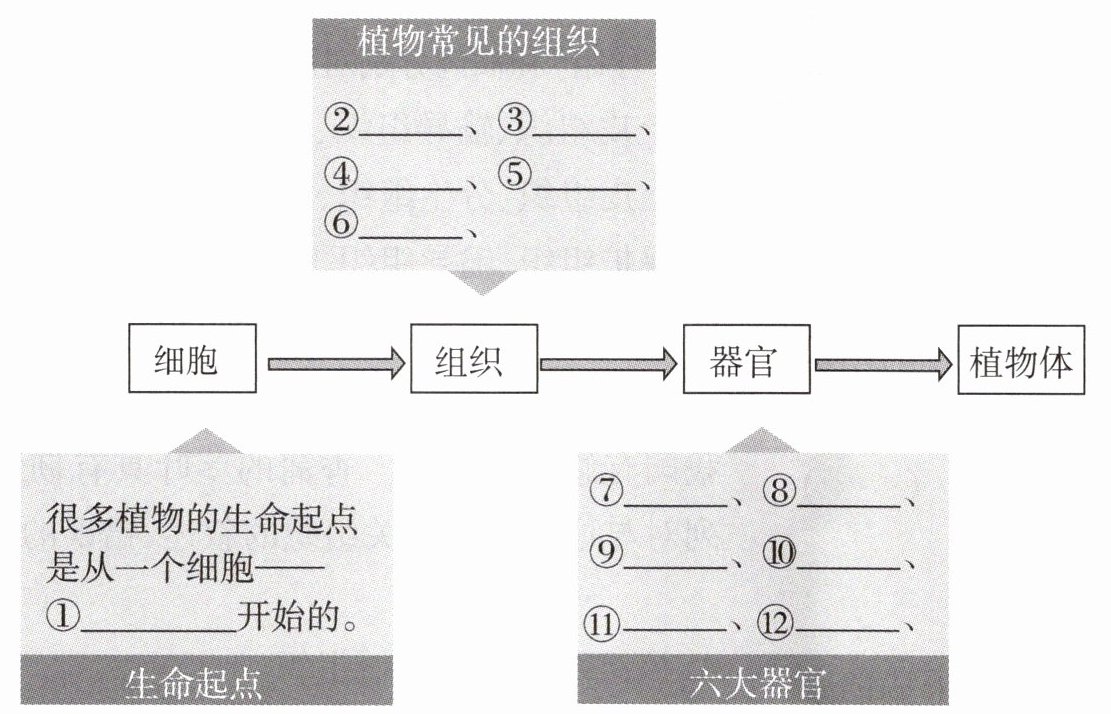 ①受精卵 ②保护组织 ③机械组织 ④输导组织 ⑤薄壁组织 ⑥分生组织 ⑦根 ⑧茎 ⑨叶 ⑩花 ⑪果实 ⑫种子