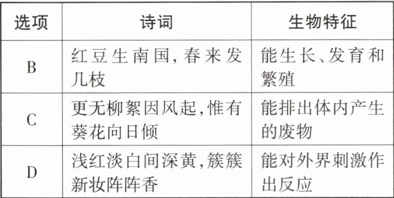 B 锄禾日当午,汗滴禾下土,是指人体能通过出汗的形式排出体内产生的废物,A 不符合题意。红豆生南国,春来发几枝,是指生物能够生长、发育和繁殖,B 符合题意。更无柳絮因风起,惟有葵花向日倾,风和太阳分别能够影响柳树和葵花的生长,体现了生物能对外界刺激作出反应,C 不符合题意。浅红淡白间深黄,簇簇新妆阵阵香,描述的是菊花一簇簇争相开放的情景,菊花颜色之间存在差异,体现了生物具有变异的特性,D 不符合题意。