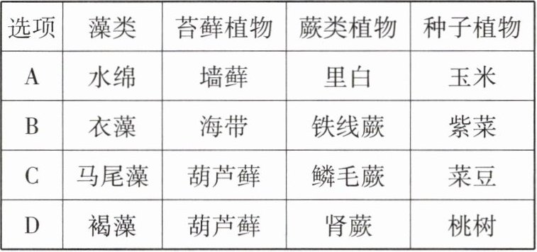 5 [2024绵阳中考]生物圈中已知的绿色植物有50余万种,可以分为四大类群。下列植物与其分类不完全匹配的一组是(