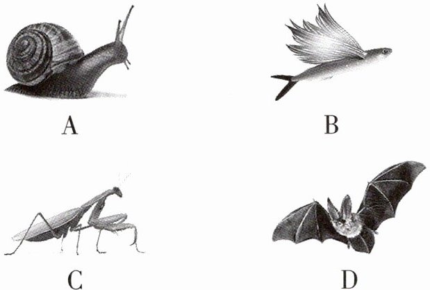 C 蜗牛属于软体动物,没有外骨骼,A错误。飞鱼生活在水中,体表常有鳞片覆盖,没有外骨骼,B错误。螳螂属于节肢动物中的昆虫,体表有坚韧的外骨骼;身体和附肢都分节,C正确。蝙蝠属于能飞行的哺乳动物,没有外骨骼,D错误。