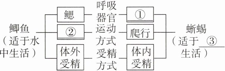 15 [2023长沙中考]下图从呼吸、运动和生殖三个方面对鲫鱼(鱼类)和蜥蜴(爬行动物)进行了比较,据图回答: