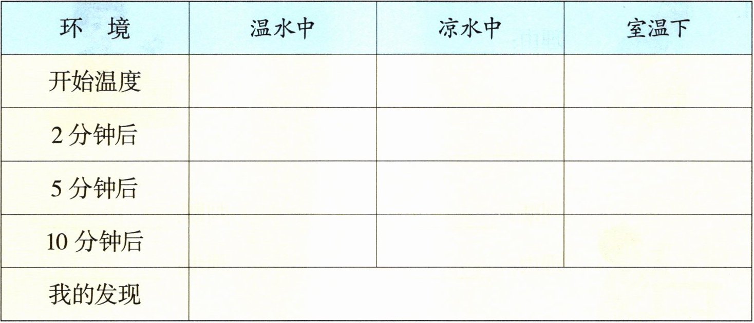 | 我的发现 | 放在温水中的杯子里的热水温度下降较慢,最终温度高于室温下的热水 | 放在凉水中的杯子里的热水温度下降比温水中快,但比室温下慢,最终温度高于室温下的热水 | 放在室温下的杯子里的热水温度下降相对较快 |