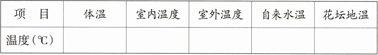 | 项目 | 体温 | 室内温度 | 室外温度 | 自来水温 | 花坛地温 |