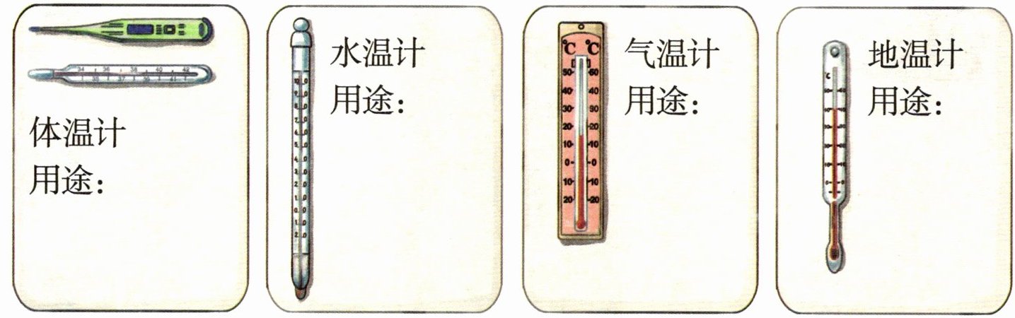 体温计用途:测量体温。水温计用途:测量水的温度。气温计用途:测量空气温度。地温计用途:测量土壤温度。