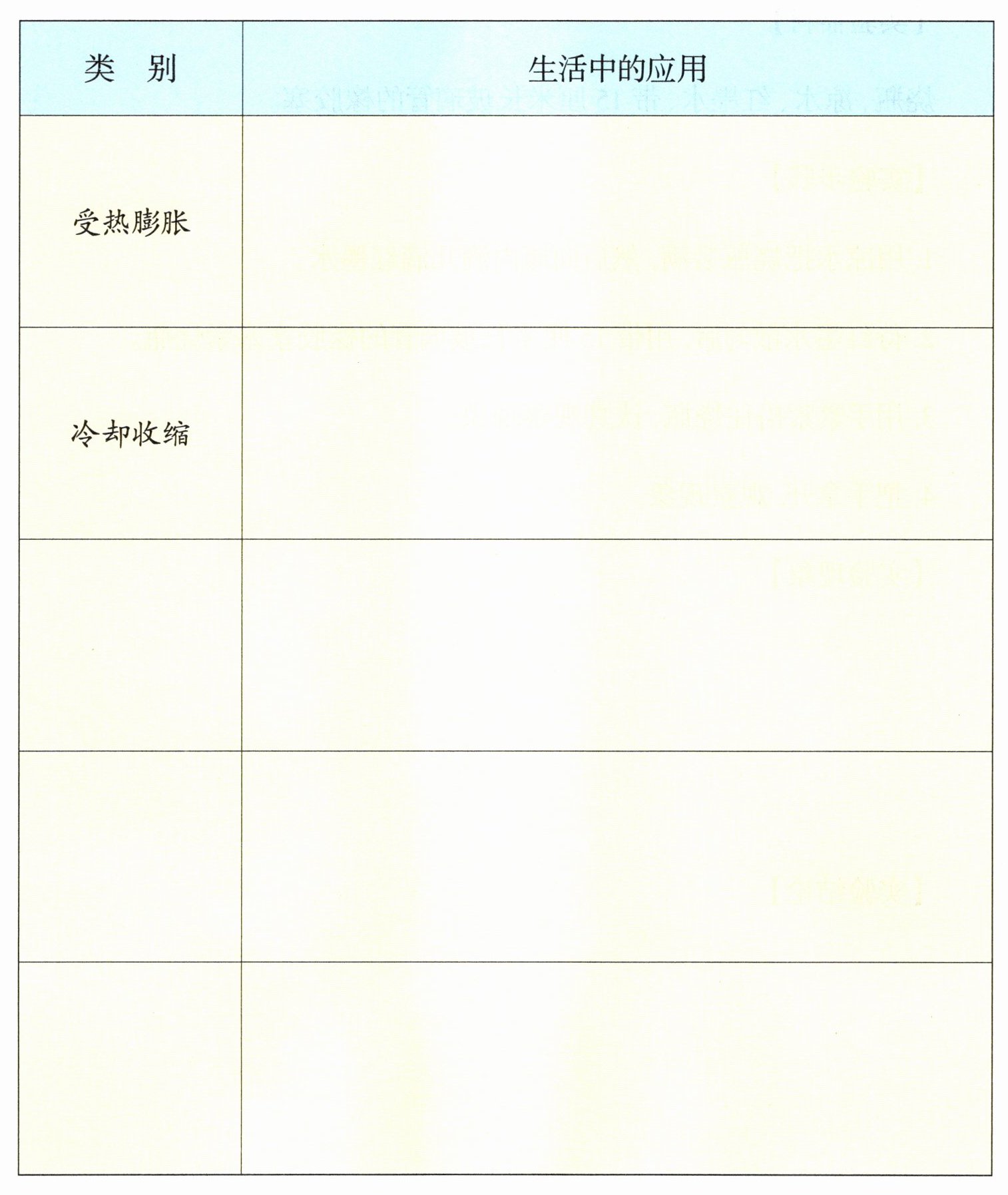 |受热膨胀|瘪了的不漏气的乒乓球放到热水中变圆;把拧不开的金属瓶盖放在热水里浸一会,瓶盖就很容易拧开了| |冷却收缩|夏天架电线不能太紧以免冬天冷缩崩断| | | | | |