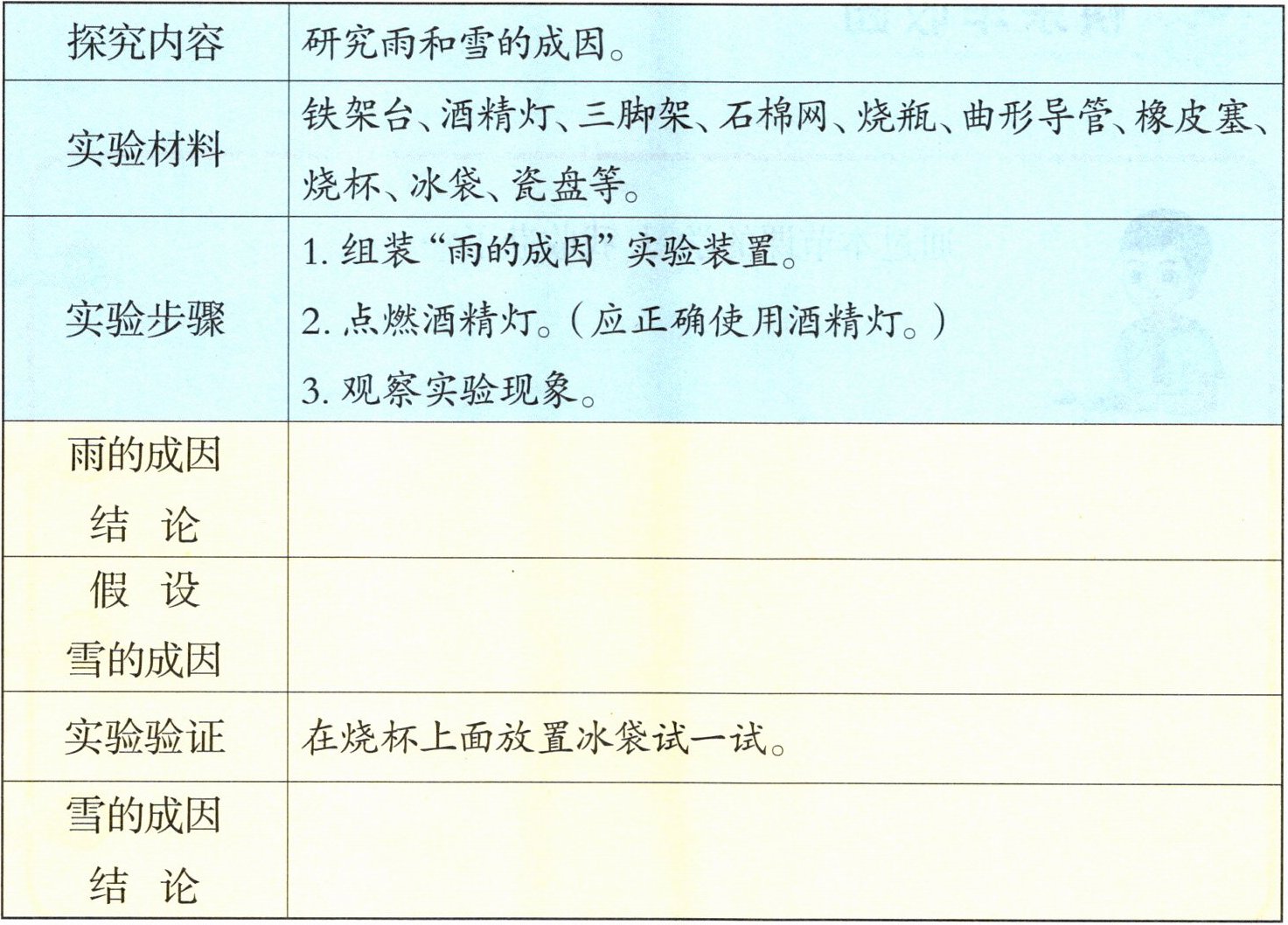 |实验步骤|1. 组装“雨的成因”实验装置。2. 点燃酒精灯。(应正确使用酒精灯。)3. 观察实验现象。|