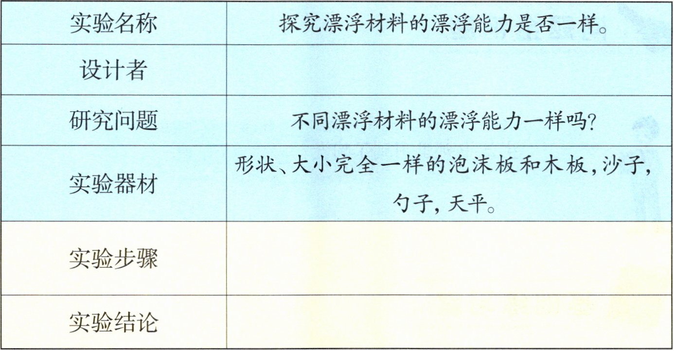 |实验器材|形状、大小完全一样的泡沫板和木板,沙子,勺子,天平。|