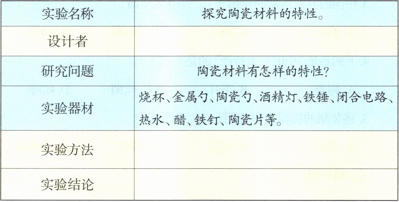 |实验器材|烧杯、金属勺、陶瓷勺、酒精灯、铁锤、闭合电路、热水、醋、铁钉、陶瓷片等。|