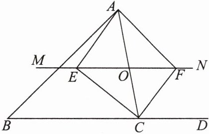(2)当点$O$运动到$AC$中点时,四边形$AECF$是矩形.证明如下: