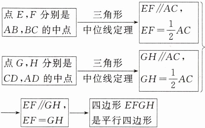 $\to\boxed{\begin{array}{l}EF//GH,\\EF= GH\end{array} }\to\boxed{四边形EFGH是平行四边形}$