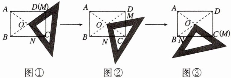 某研究性学习小组在探究矩形的折纸问题时,将一块三角尺的直角顶点绕着矩形 $ABCD (AB < BC)$ 的对角线交点 $O$ 旋转(如图①→②→③),图中 $M$,$N$ 分别为三角尺的直角边与矩形 $ABCD$ 的边 $CD$,$BC$ 的交点.