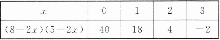 2. 小颖在学习“求一元二次方程的近似解”时,对方程$ (8 - 2x)(5 - 2x) = 18 $的根做了如下估计: