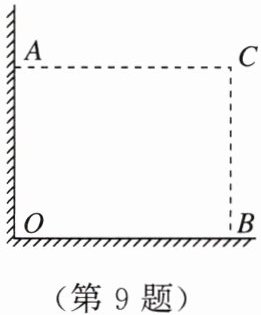 9. 如图,在直角墙角 $AOB$($OA⊥OB$,且 $OA$,$OB$ 长度不限)中,要砌 $20$ m 长的墙,与直角墙角 $AOB$ 围成地面为矩形的储仓,且矩形地面 $AOBC$ 的面积为 $96$ m^2,求这块矩形地面的长。