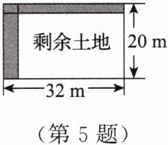5. 如图,在宽 20 m、长 32 m 的矩形土地上,修筑横向、纵向道路各一条,且它们互相垂直,若纵向道路的宽是横向道路的宽的 2 倍,要使剩余土地的面积为$ 504 m^2,$求横向道路的宽为多少米。